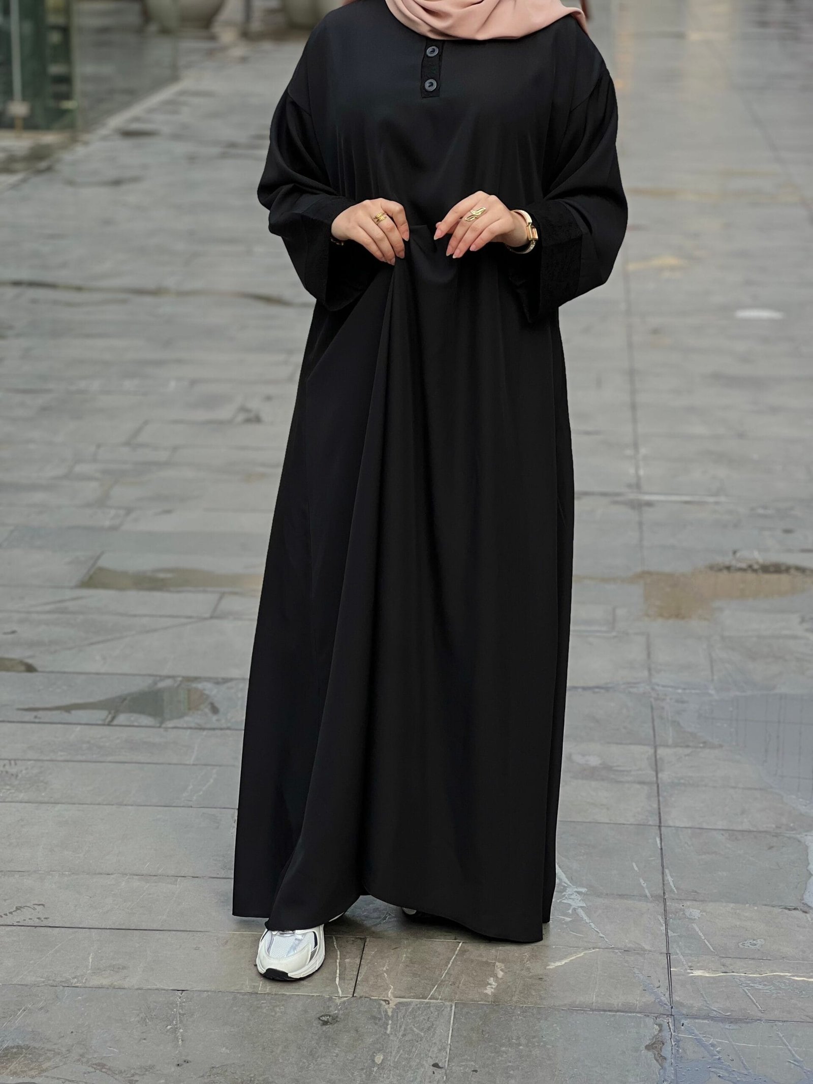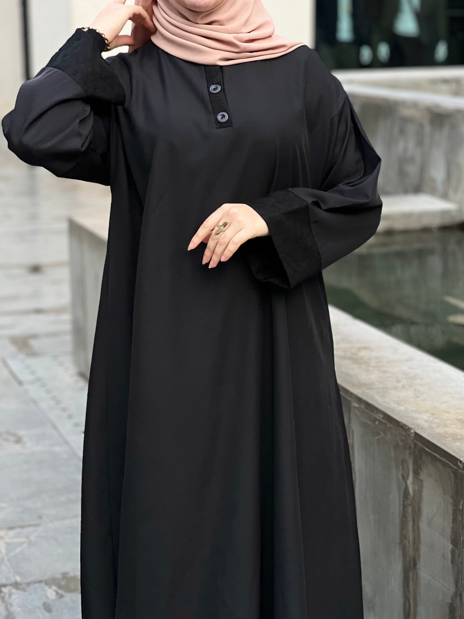 • عملي لكل يوم: الأزرار الأمامية ليست مجرد زينة، بل تجعل ارتداء العباءة سهلاً وسريعاً، وهي مثالية للأمهات والنساء العاملات.