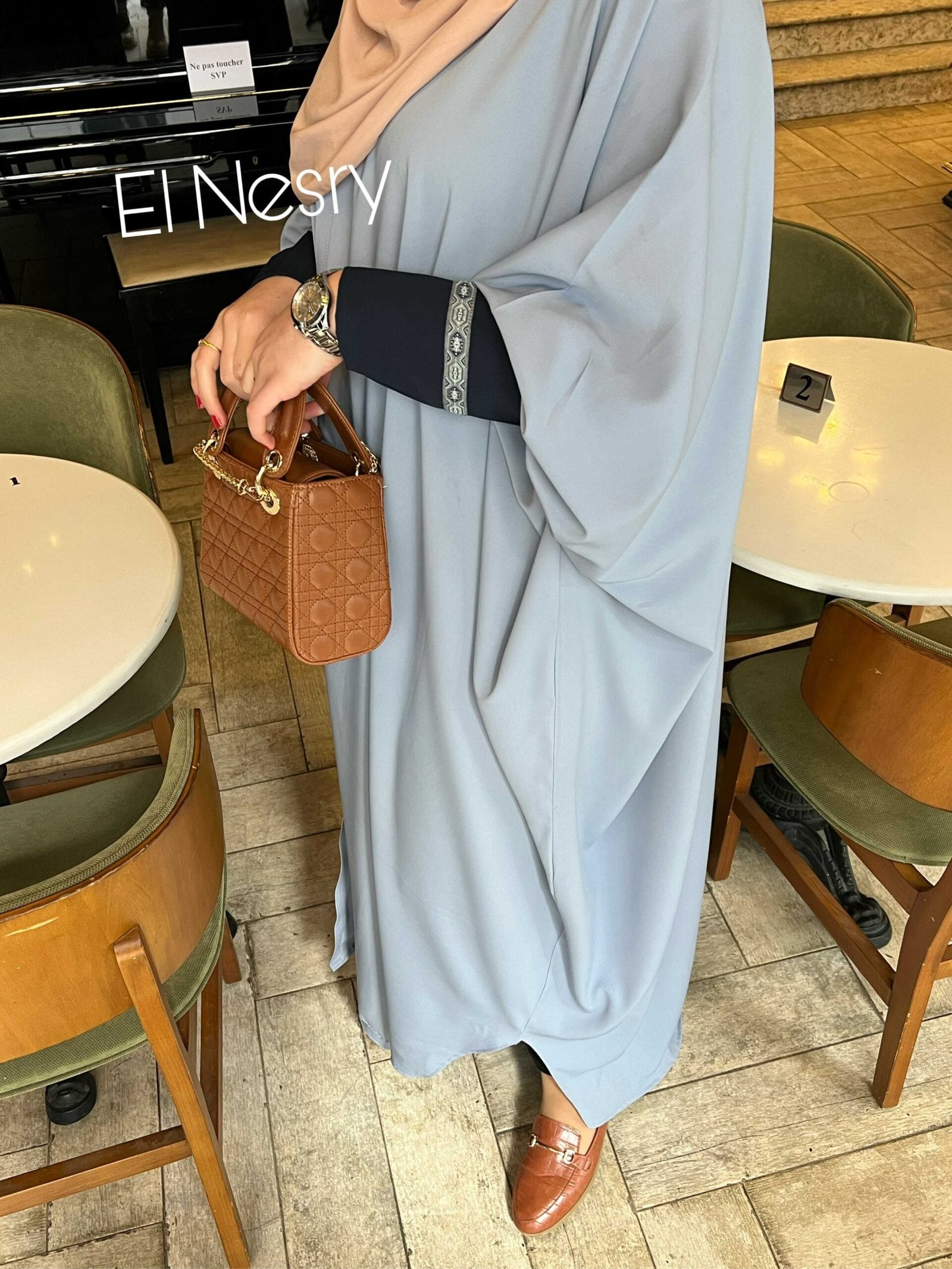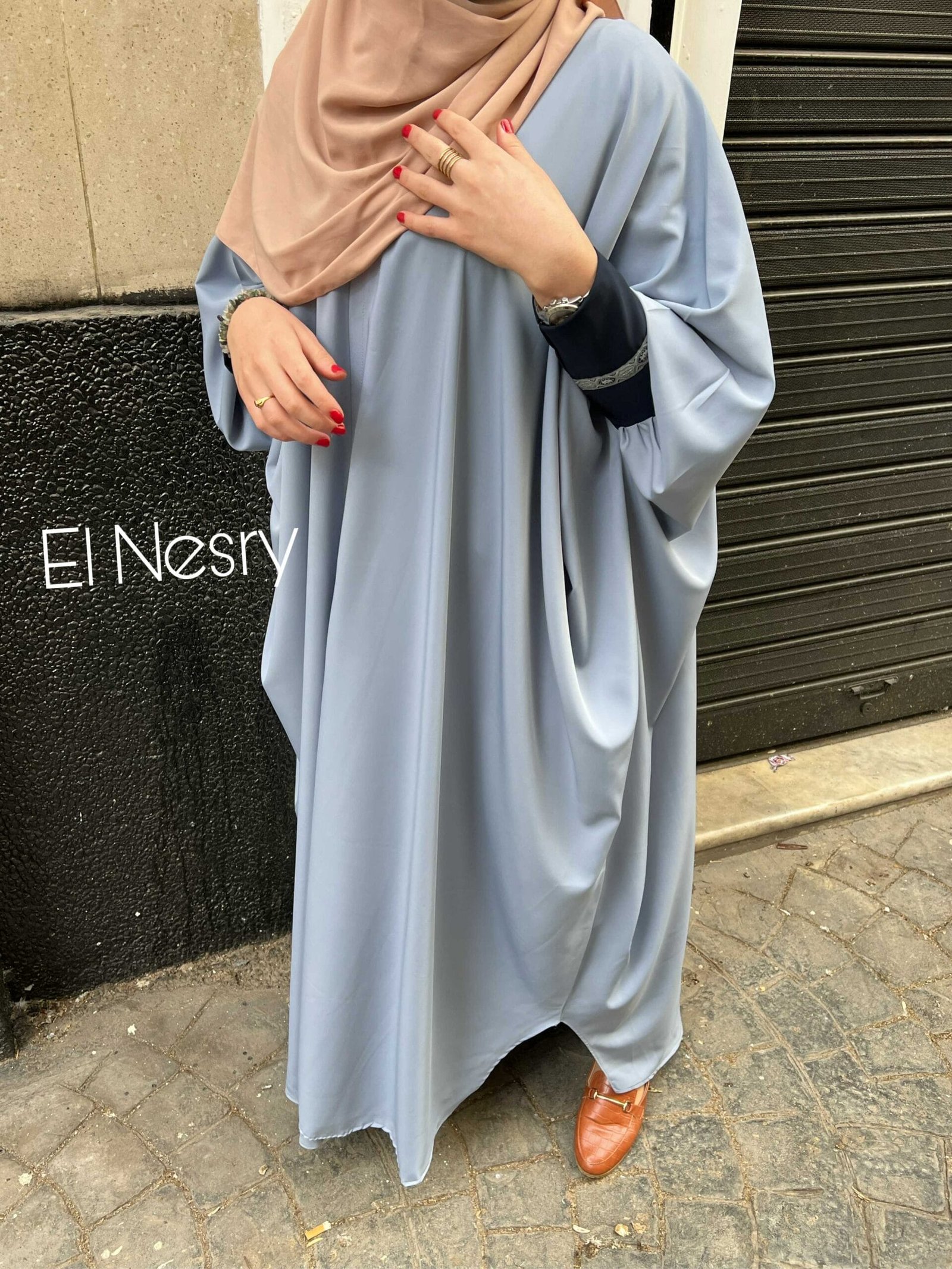 Abaya oversized découpe butterfly ouverte avec des manches serrées aux poignets ornés d’un détail élégant.