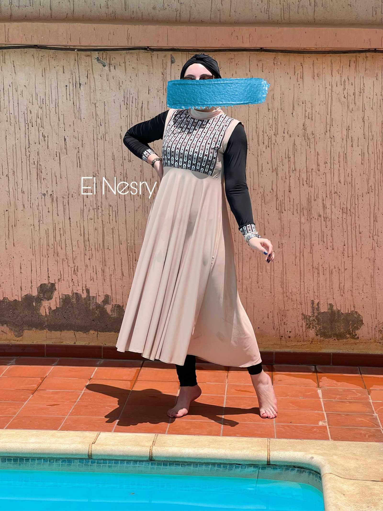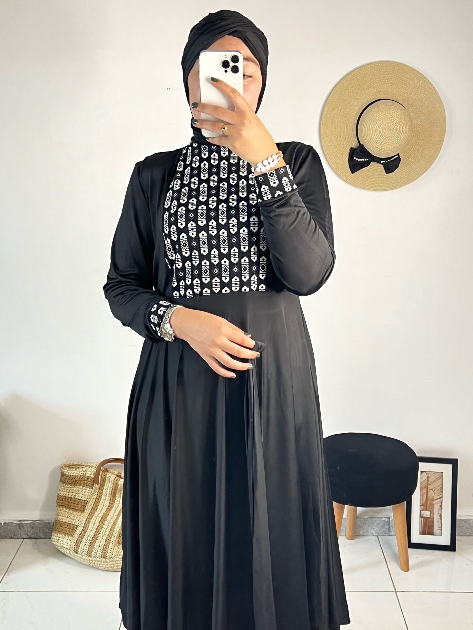 Maillot de bain composé de 3 pièces : une tunique longue et évasée, un legging de bain et un bonnet de bain.