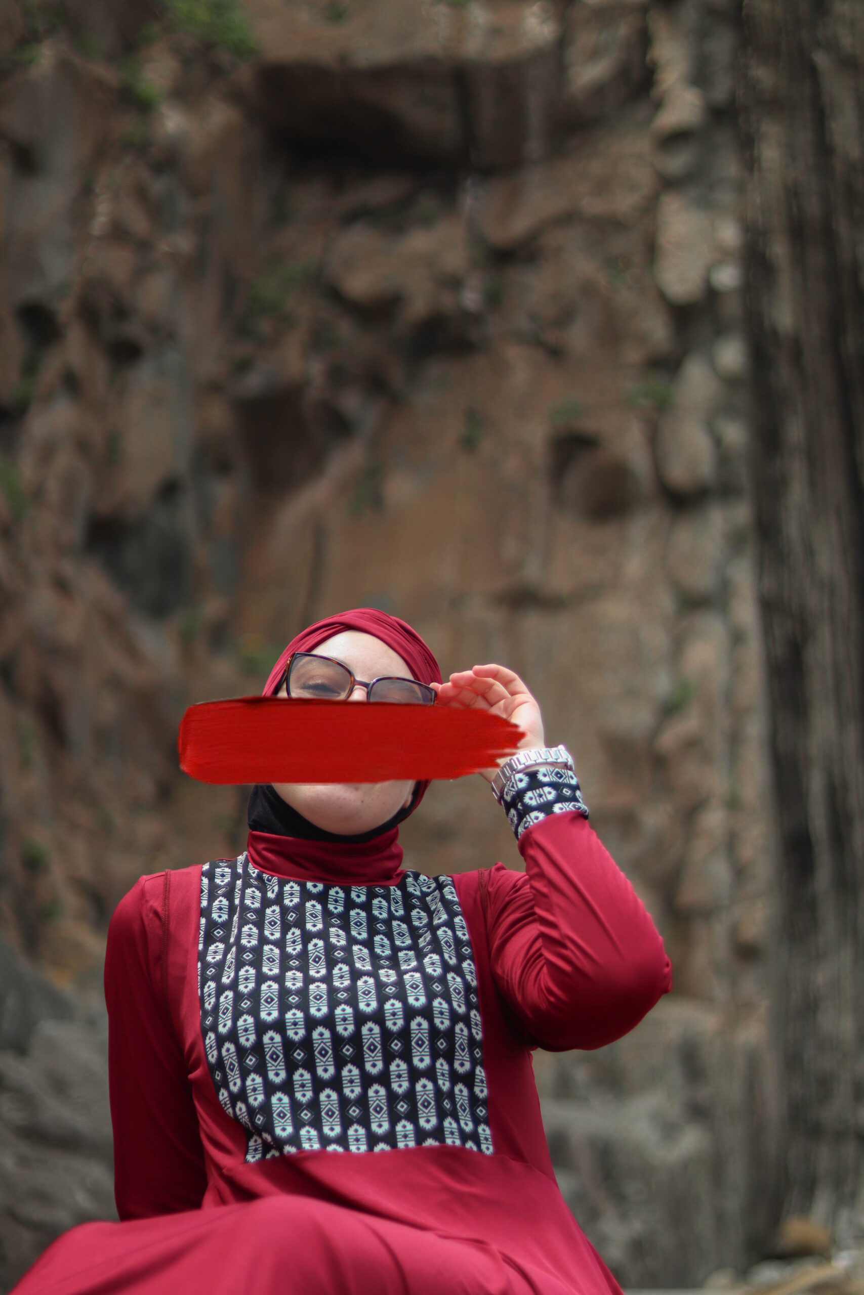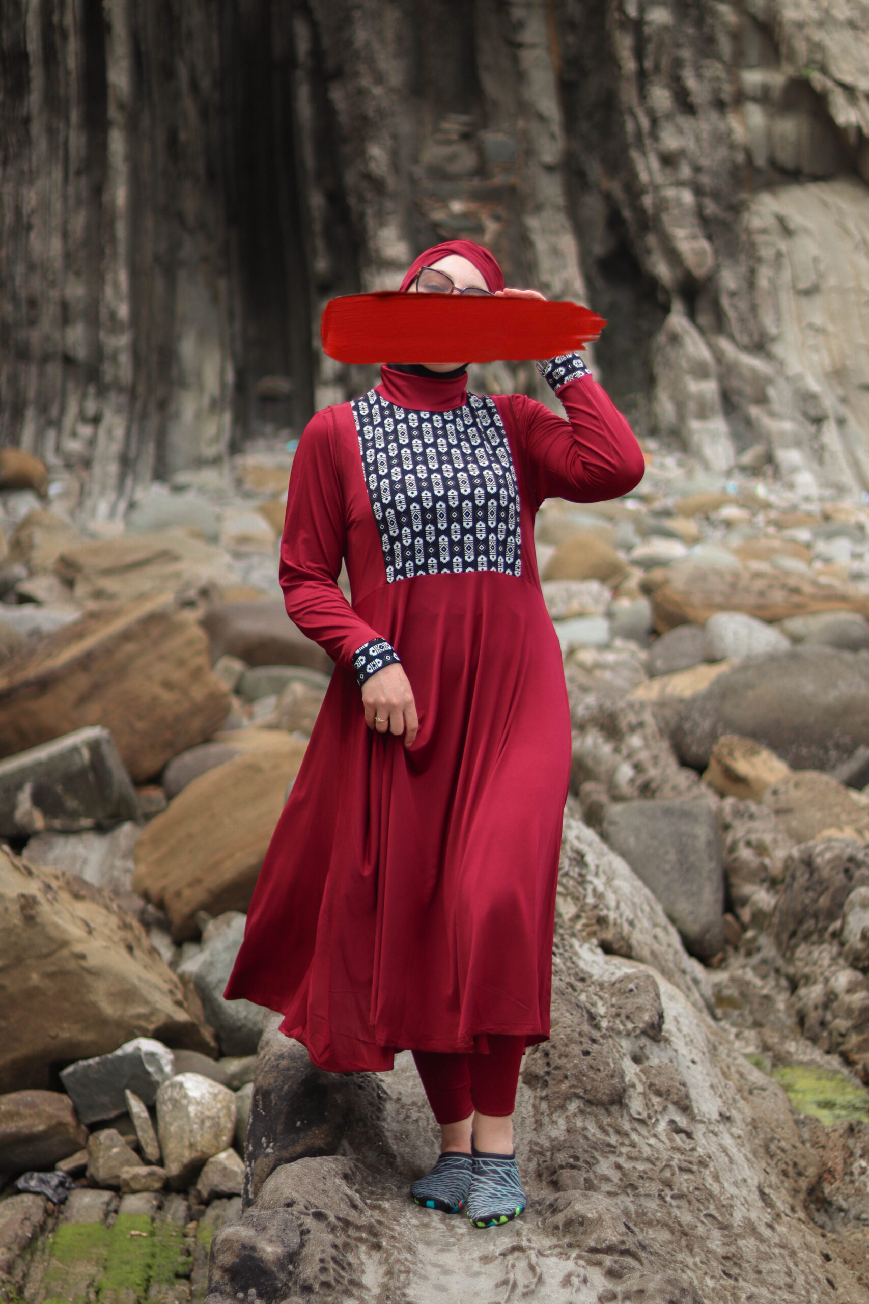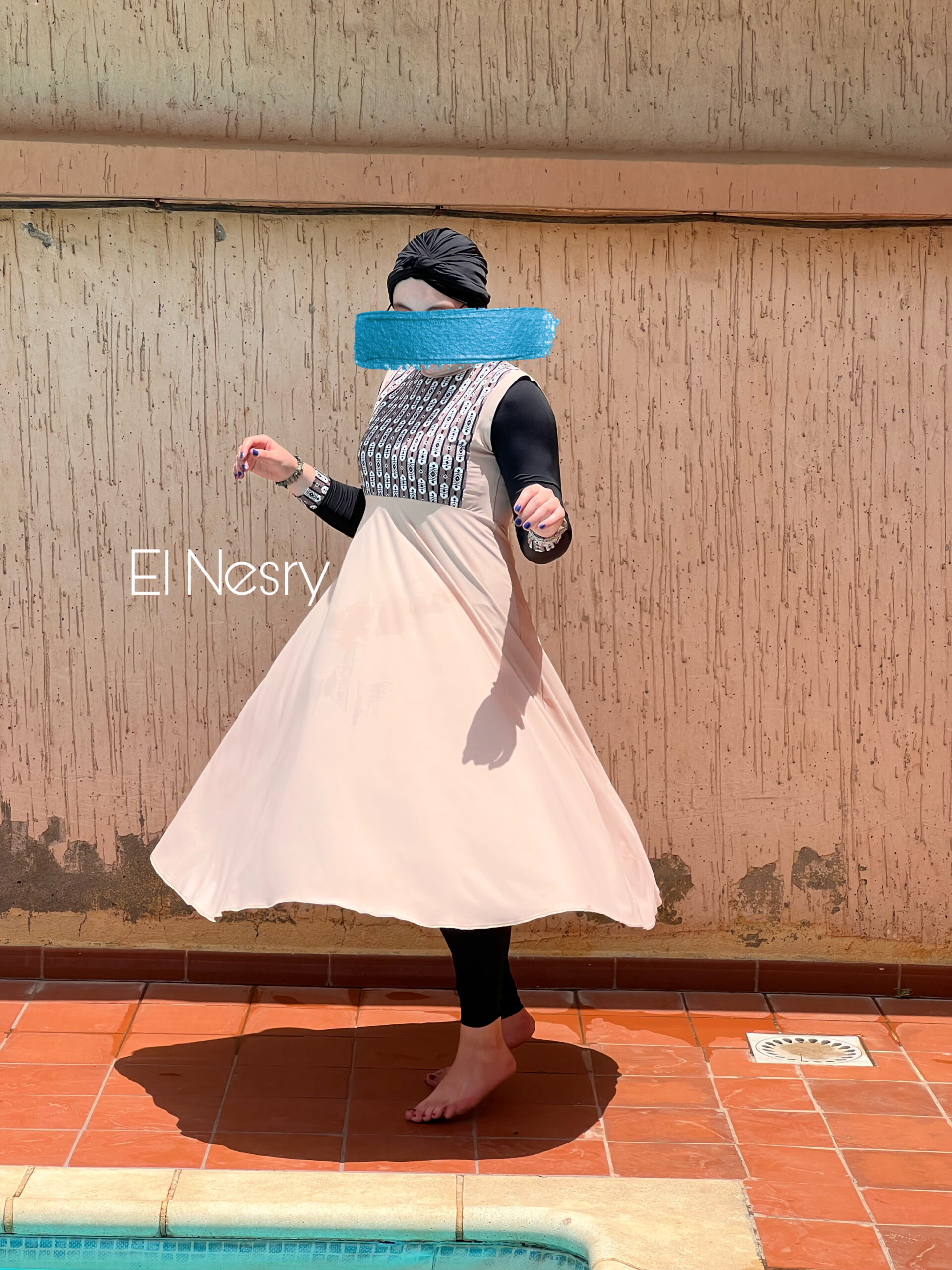 Maillot de bain composé de 3 pièces : une tunique longue et évasée, un legging de bain et un bonnet de bain.
