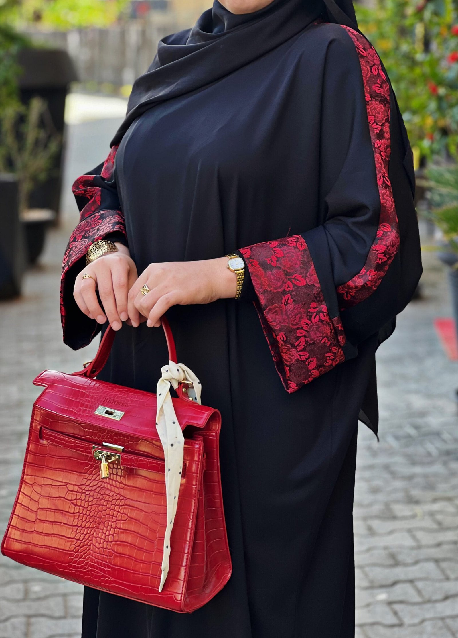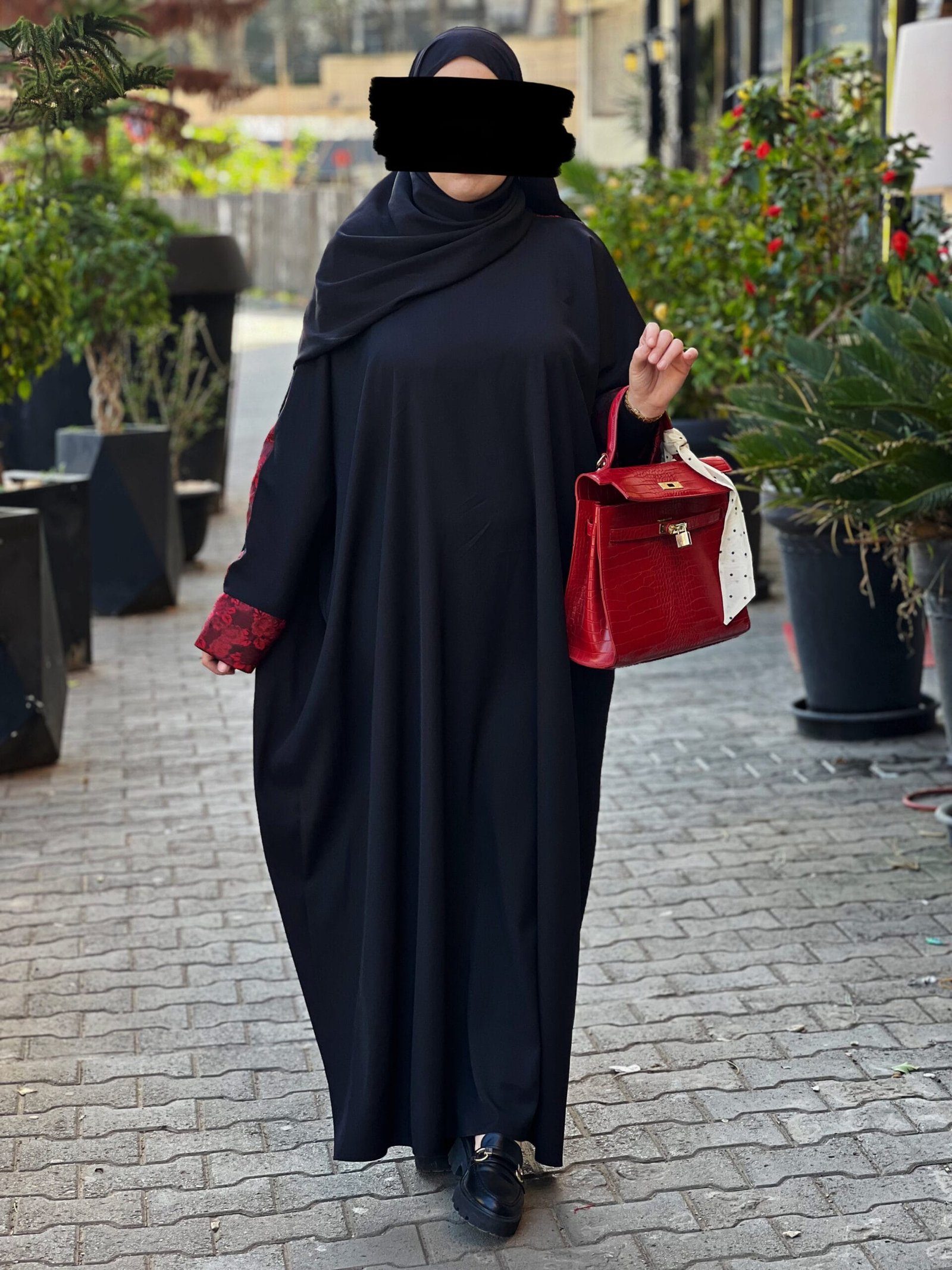 حجاب واسع فاخر – أسود بتفاصيل بروكارد حمراء