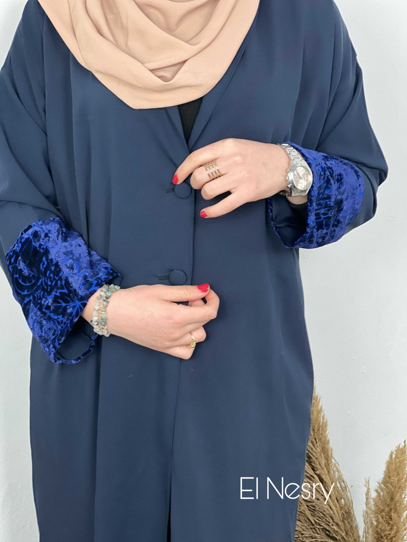 Abaya semi ouverte découpe simple classique avec un détail velours sur les manches.