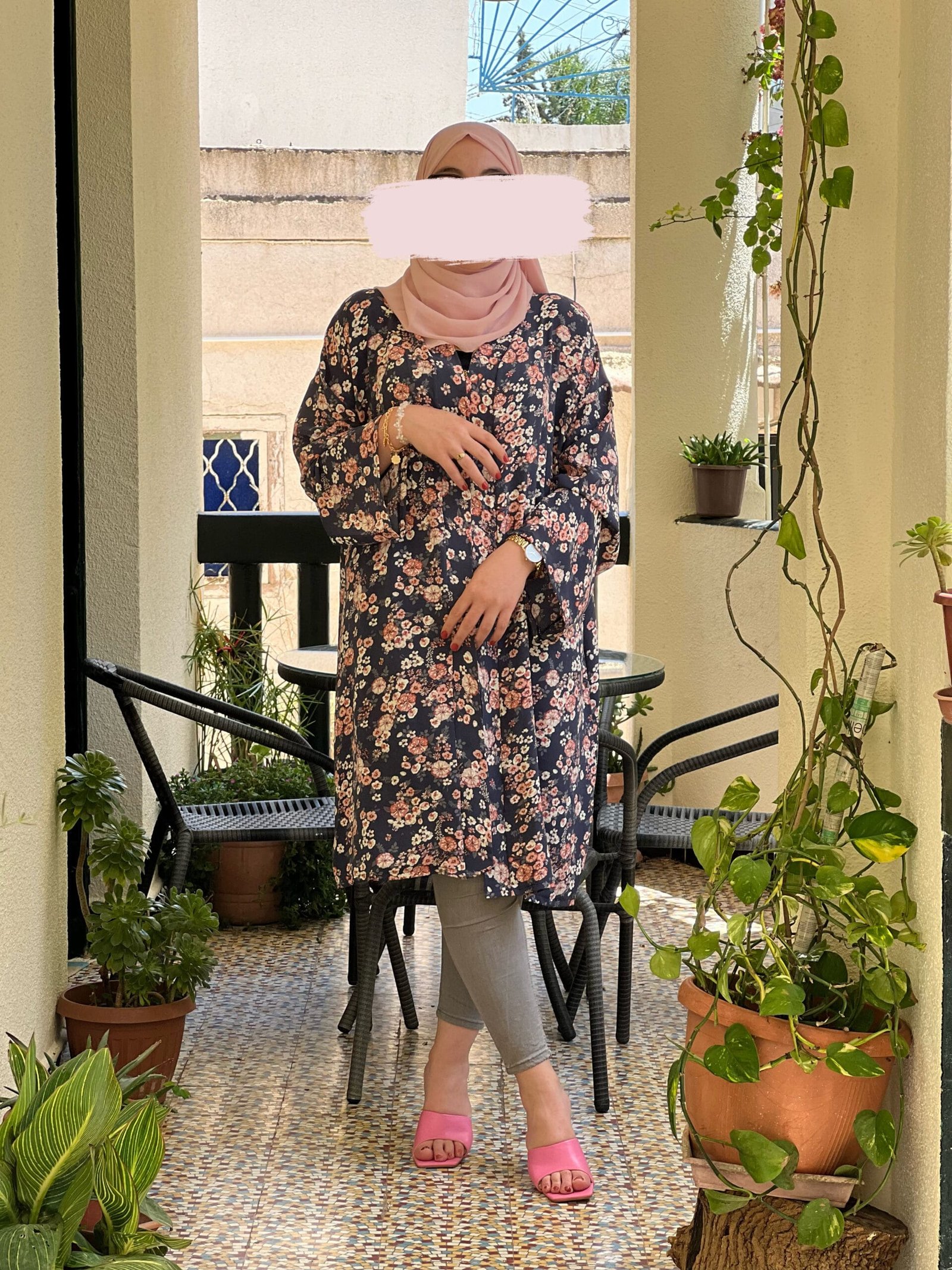 Kimono mi-long (110cm de longueur) se porte ouvert, conçu avec un tissu imprimé a petites fleurs, fluide et opaque convenable pour la saison estivale. Épaules tombantes; manches longues.